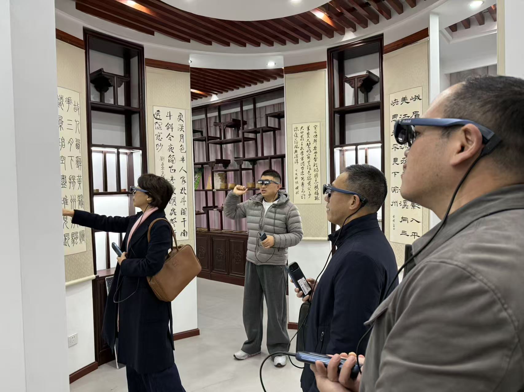 季益龙副主任详细介绍了文科中心的发展历程、组织架构、教学体系及分中心建设情况。随后,王春波书记一行实地参观了中心的特色实验室,包括陶艺、茶艺、木作雕刻、AR创新实验室、AR导览体验室及观摩室。在AR导览体验室,考察团亲身体验了AR数字眼镜在数字展厅导览及实验教学中的前沿应用,对技术赋能文科综合实验中心给予高度关注。