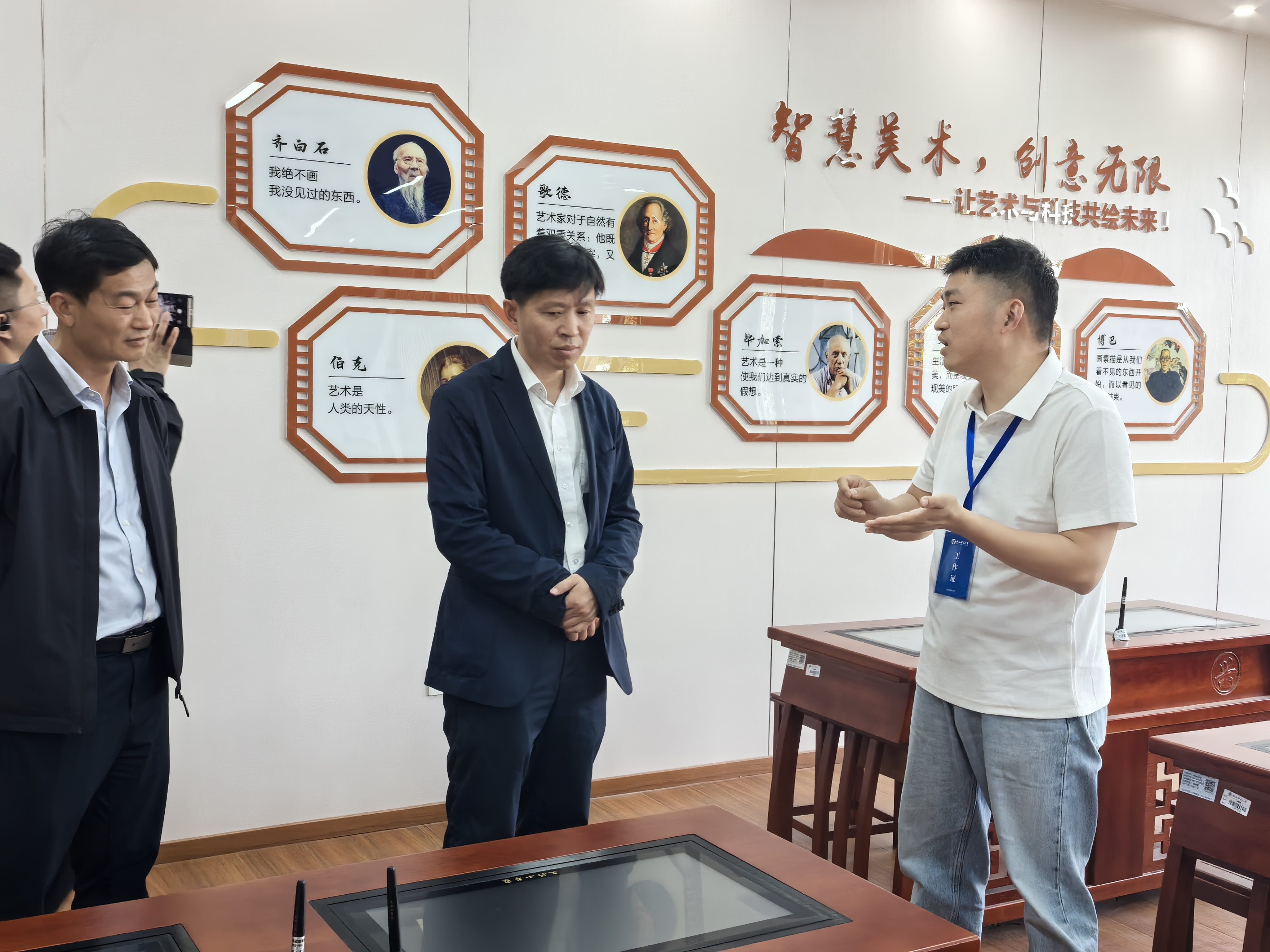 季益龙带领胡金明校长一行先后实地参观了陶艺、茶艺、木作雕刻、智慧美术、艺术欣赏等特色实验室,并详细介绍了文科中心的基本概况、建设理念与发展规划,重点阐述了中心立足地方特色文化、深度融入人文实践课程的特色发展路径及取得的建设成果。